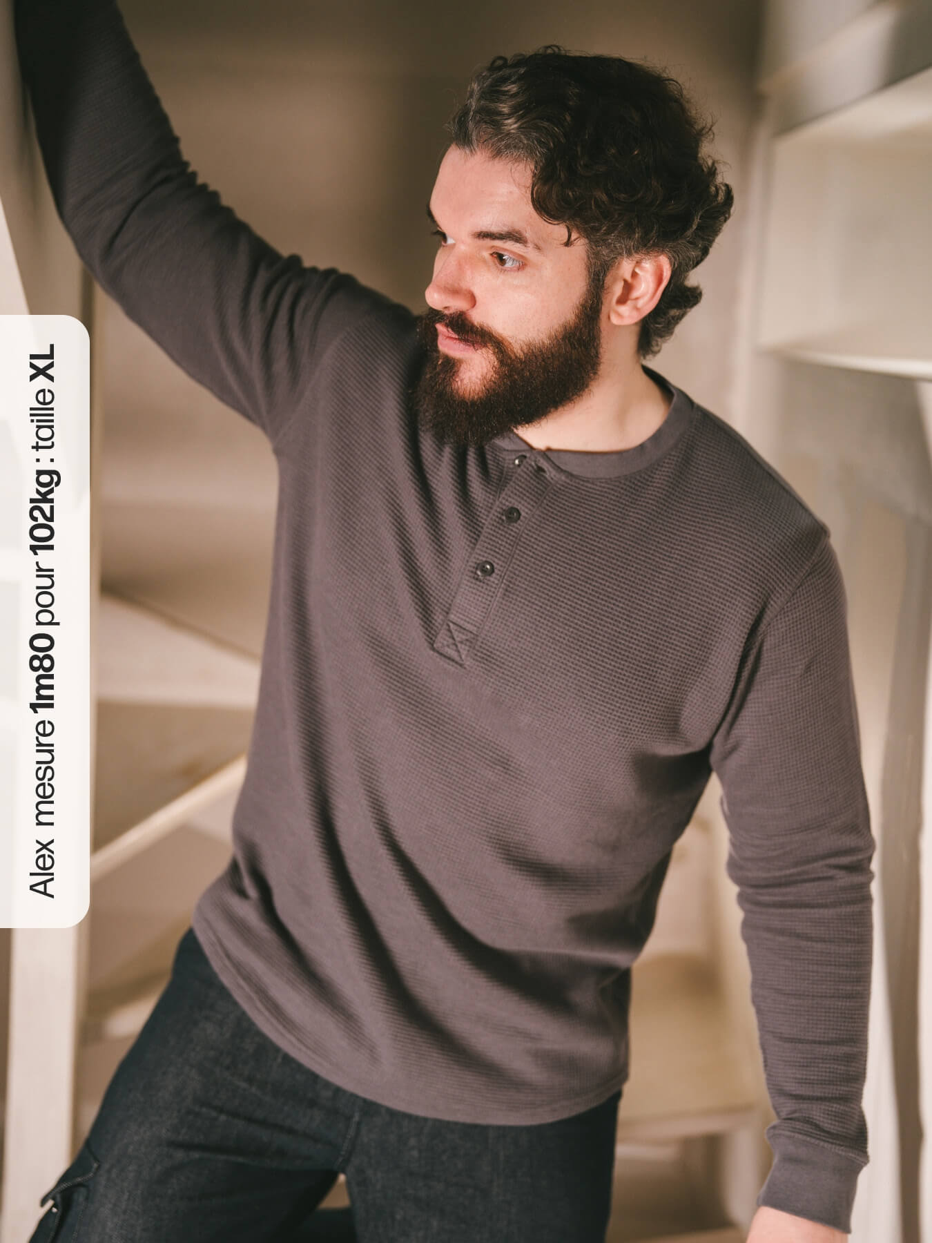 Ce Henley est confectionné au Portugal, dans la région de Guimarães, à 1000 kilomètres tout pile de notre centre de logistique dans le Gers. Nous travaillons avec le même atelier depuis nos débuts, qui produit également tous nos T-shirts.