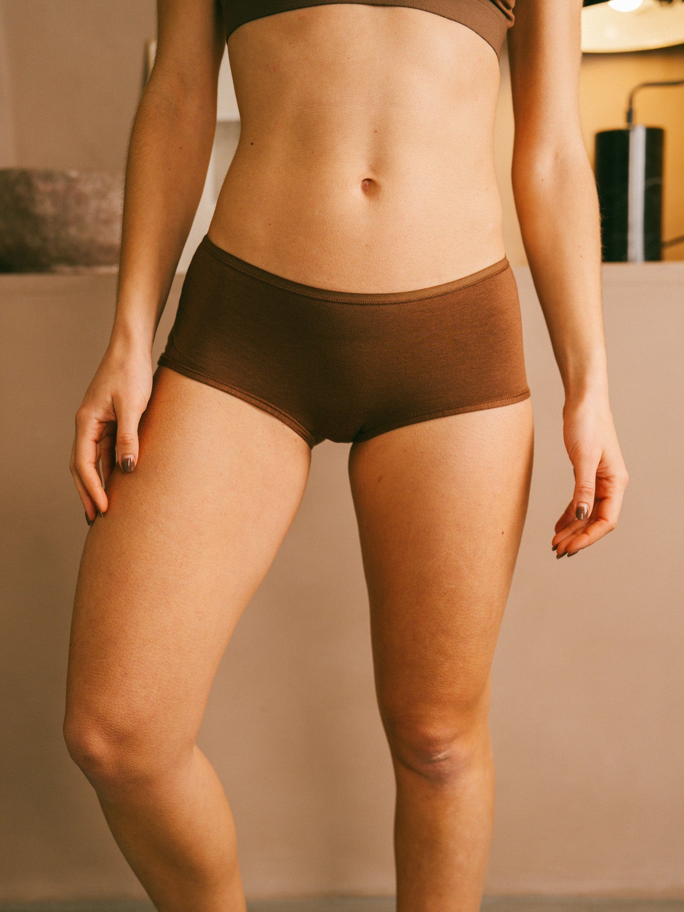 Avec sa taille classique, ni taille haute, ni taille basse, ce shorty se positionne naturellement sur le ventre, sans serrer ni comprimer. Sa coupe enveloppante couvre bien les hanches et les fesses, pour une sensation de maintien doux tout au long de la journée.